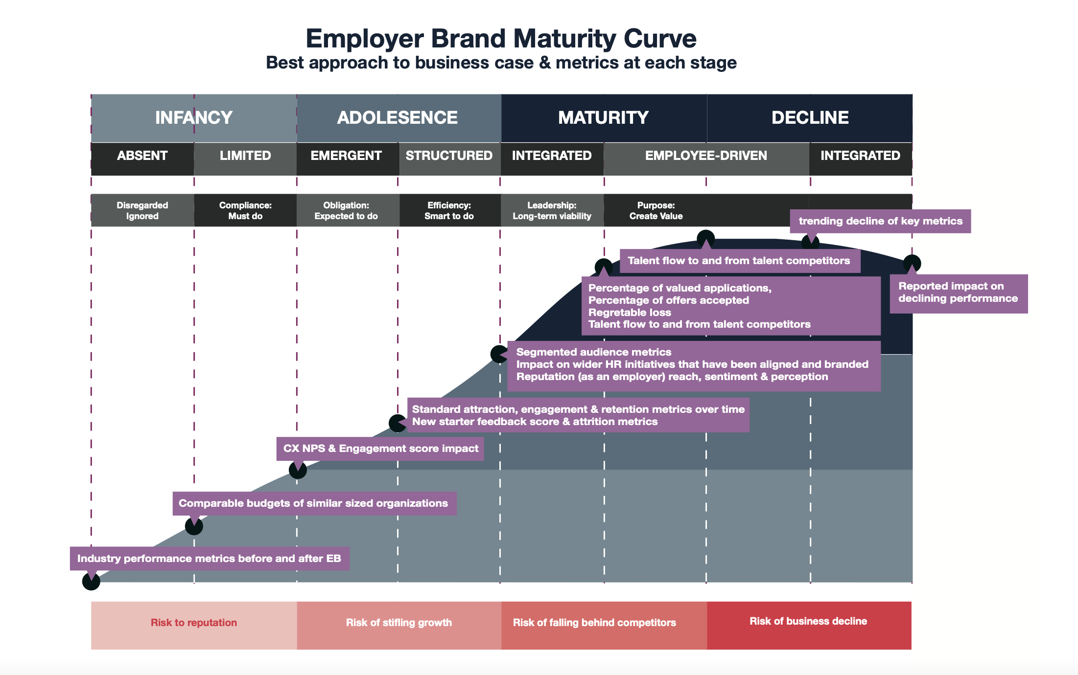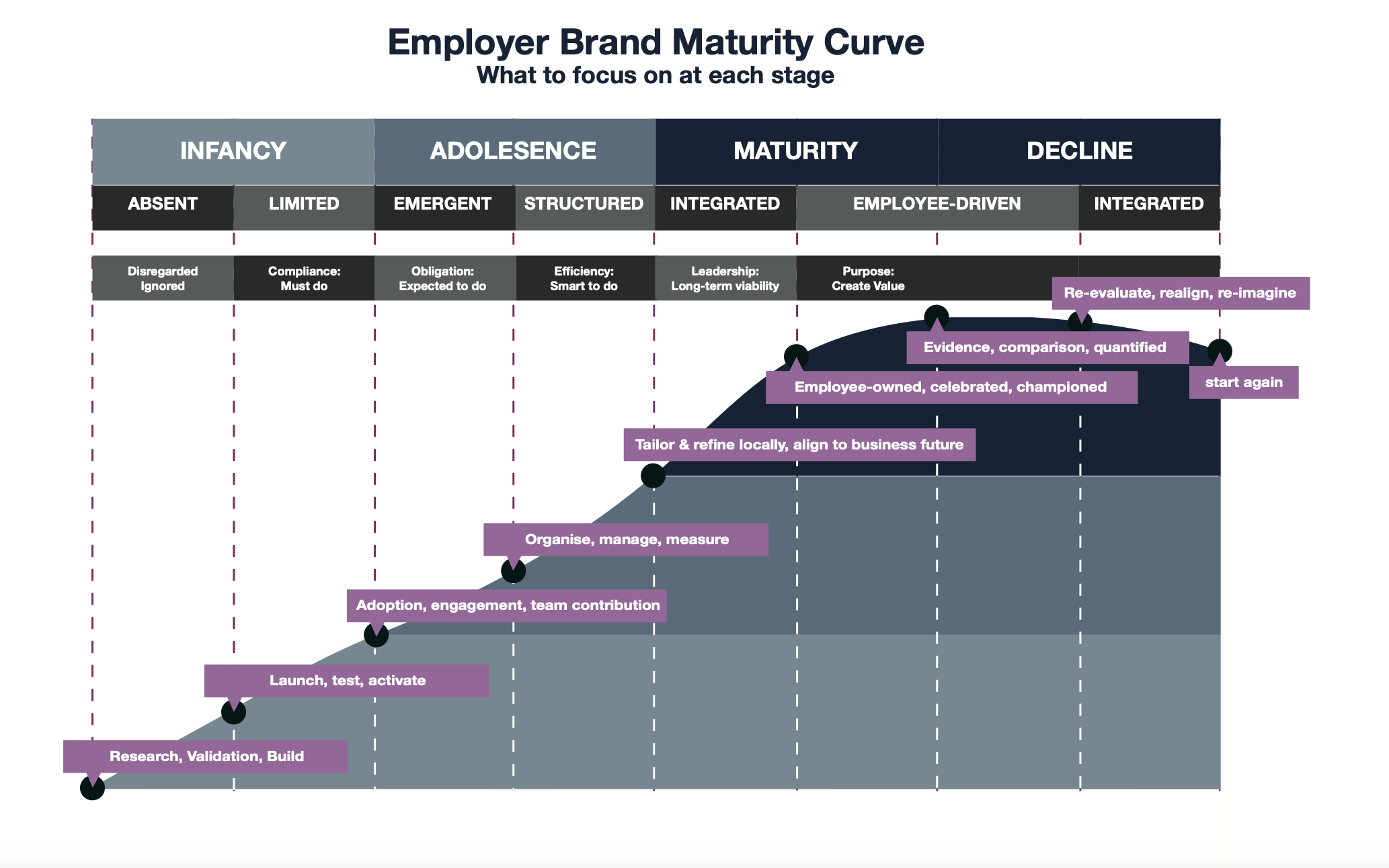 Gauging your employer brand maturity will help you effectively dictate the level of resources and the sophistication of your internal communications, allowing you to start making progress rather than just spinning your wheels. For example, trying to lead the employer brand charge can be painful and frustrating if you begin in the wrong place. Knowing where your company is on the employer branding maturity model ensures you know how to prioritise your next moves. That way, you can name the most immediate challenges you need to overcome and focus on what’s urgent.